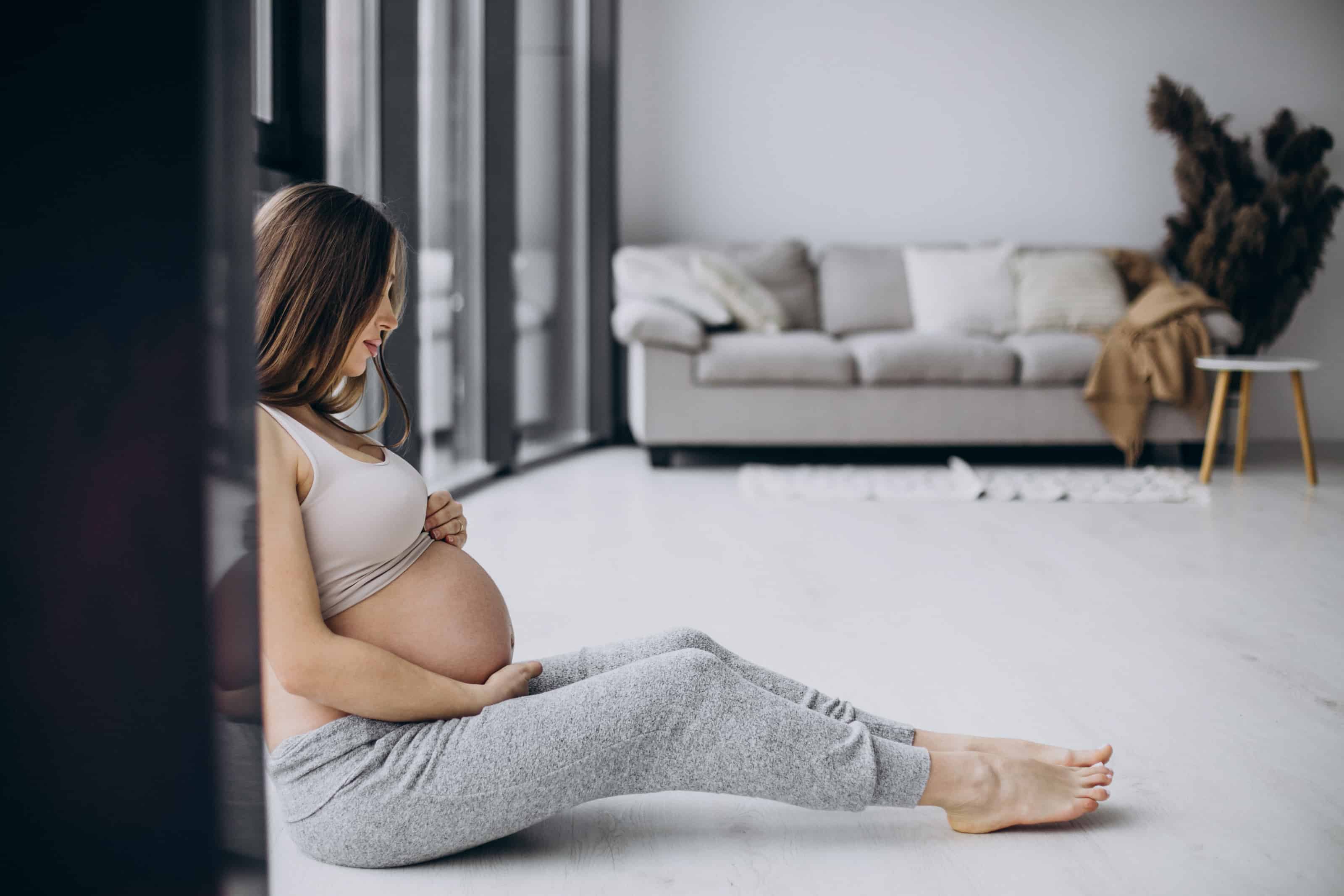 Pregnant woman having rest after exercising at home