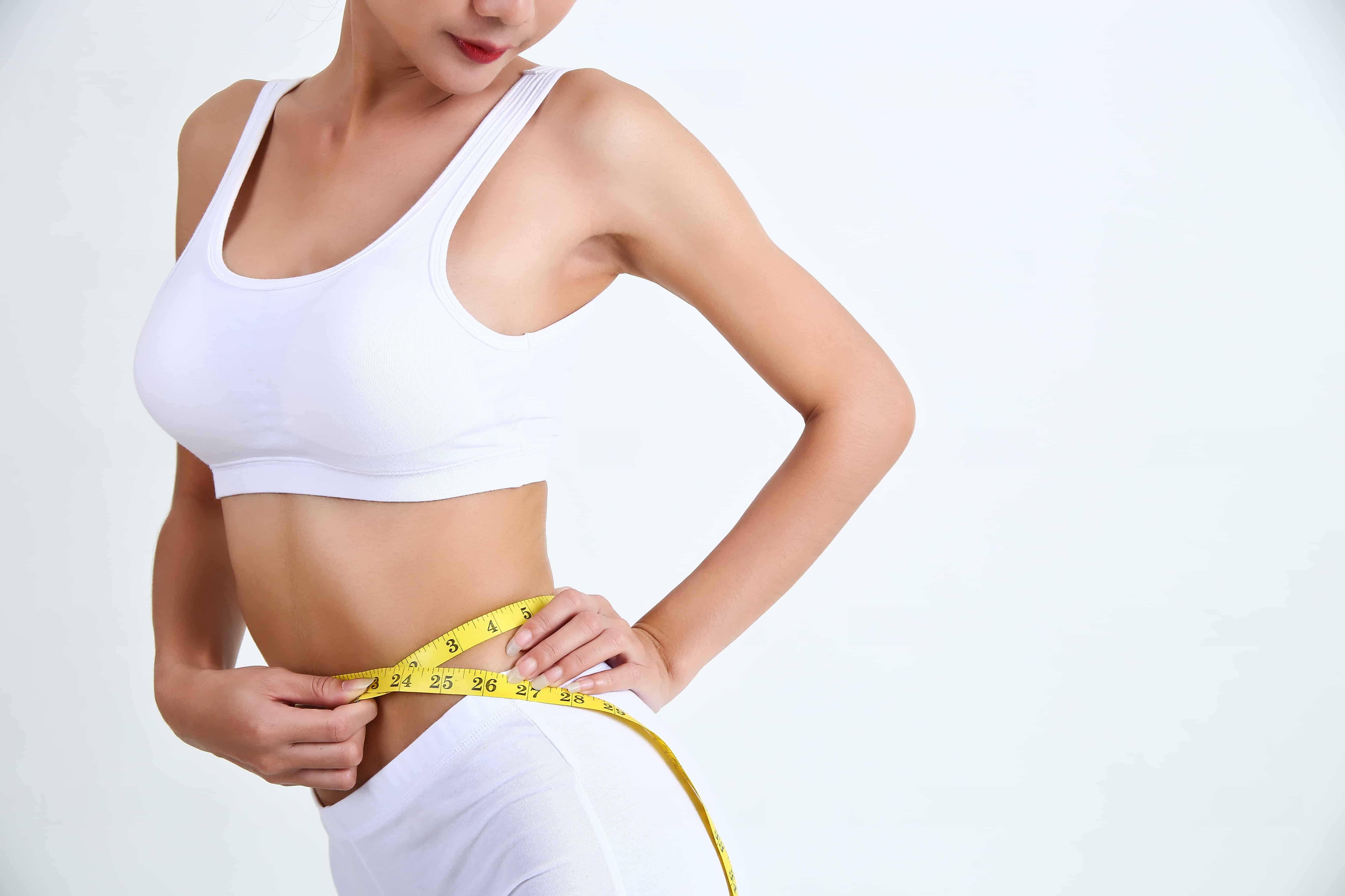 Close up slimming female with beautiful body and measuring her waistline with measure tape on white background and copy space